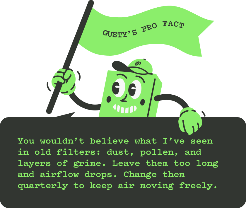 Gusty’s the friendly face of clean air. He’s dependable, upbeat, and always at the ready, a reminder that simple filter upkeep can make all the difference. From our vans to your reports, he’s there to keep things light, bright, and done right.